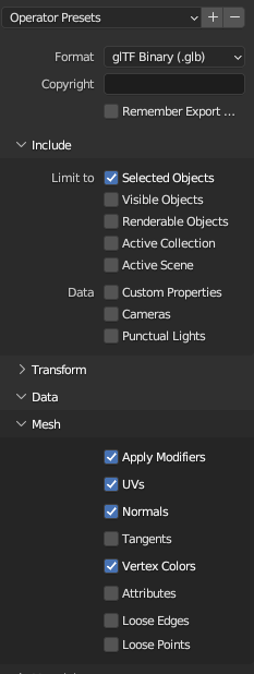 We recommend using .gltf while you’re working on a scene, but then switching to .glb when uploading it.