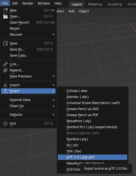 To export select the models you want to be contained on the .glb file then go to File - Export - glTF 2.0