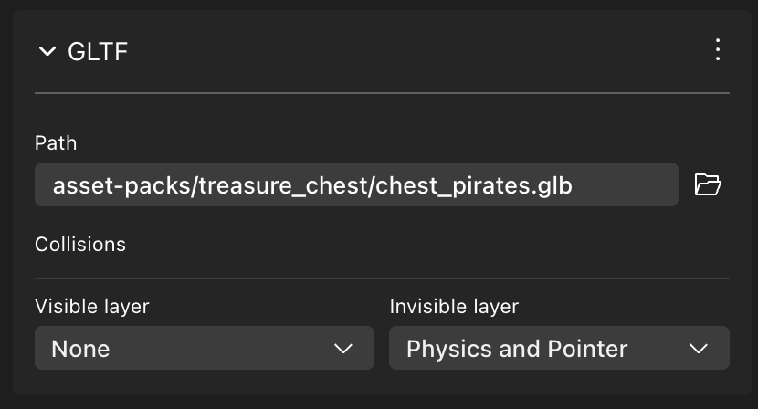 By default, the visible geometry of a GLTFContainer isn’t mapped to any collision layers, but the invisible geometry affects both the Physics and the Pointer layers. You can change this value to only affect one, or neither, and to affect custom layers instead. You can also configure the visible geometry layer in the same way.