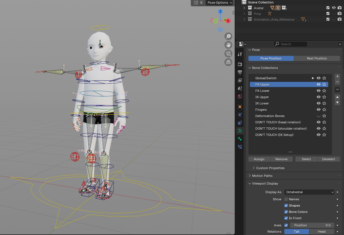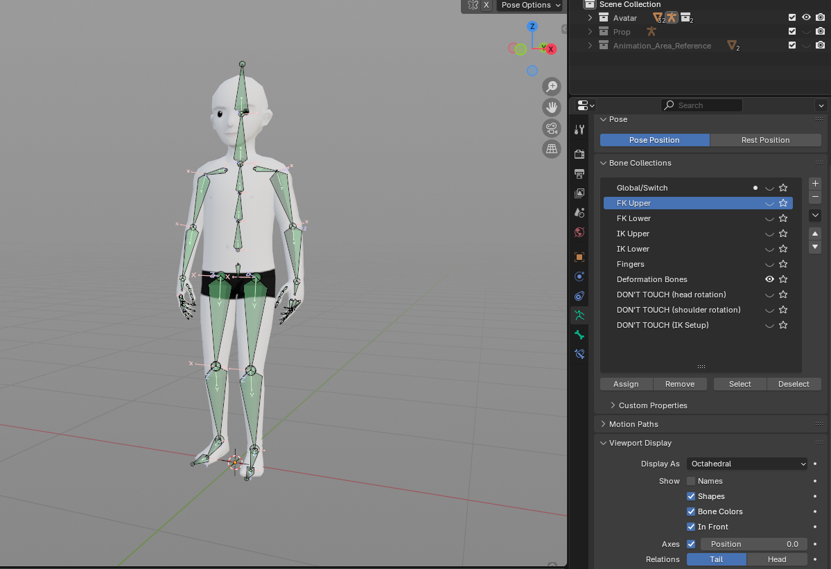 A rig is a virtual skeleton that allows a model to move. It consists of a hierarchy of individual bones, much like a real life skeleton, and it works under a parent/child relationship. This document will cover some basic rigging concepts, such as bone position, bone orientation, deforming and non-deforming bones, the difference between IK and FK and their purposes. The structure of an avatar’s rig, custom attributes, and setup for animating can be found in rig features .