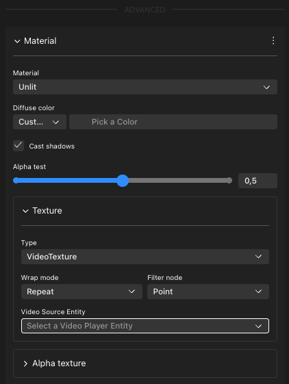 1. Still on the second video player, open the Material component, expand the Texture section, and select the Video Source Entity dropdown to point to the first video player.
